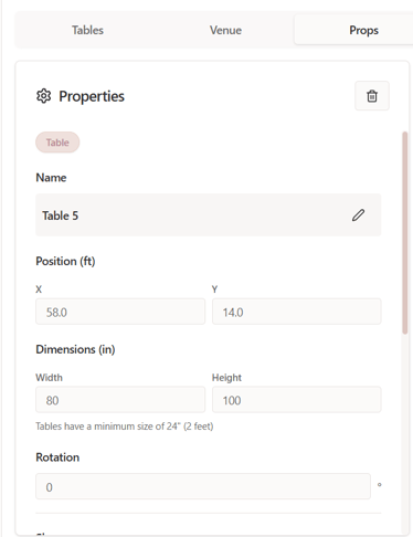 Tables in the Seated With Love Floor Plan Editor can be resized to match the real-world dimensions of the tables used at your venue. Adjusting table dimensions helps ensure that the digital event floor plan accurately reflects the true scale of the venue layout, making it easier to plan seating arrangements, maintain walkways, and organize the event space effectively.