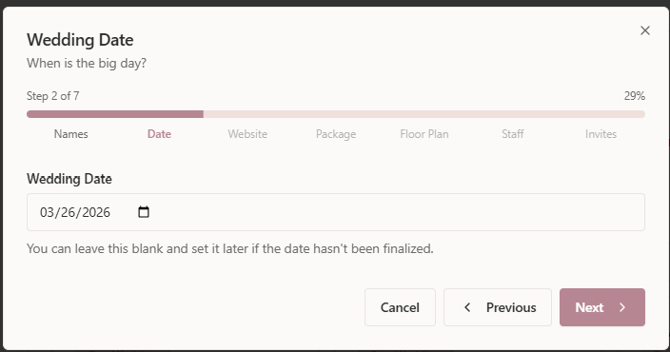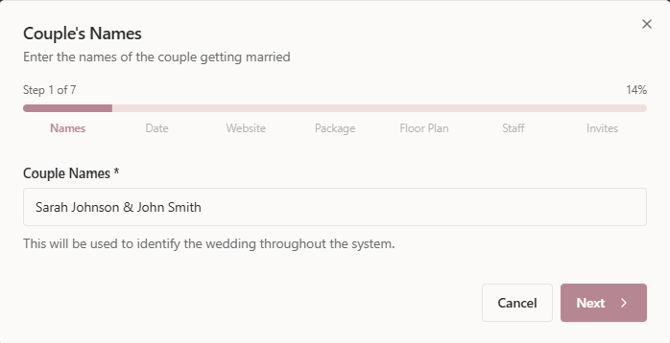 Creating a wedding in Seated With Love is the main way venues organize and manage events happening at their venue. Each wedding acts as a dedicated workspace where you can manage planning details, communicate with couples, assign staff, and configure tools such as packages, floor plans, and wedding websites.