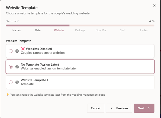 Select how the wedding website should be handled for this couple. You can choose from the following options:-