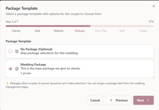 Select a package template that contains questions, forms, and planning details for the couple.-