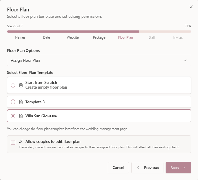 Assign a floor plan – A template floor plan will be copied to the couple’s wedding. You can edit this floor plan specifically for their event.