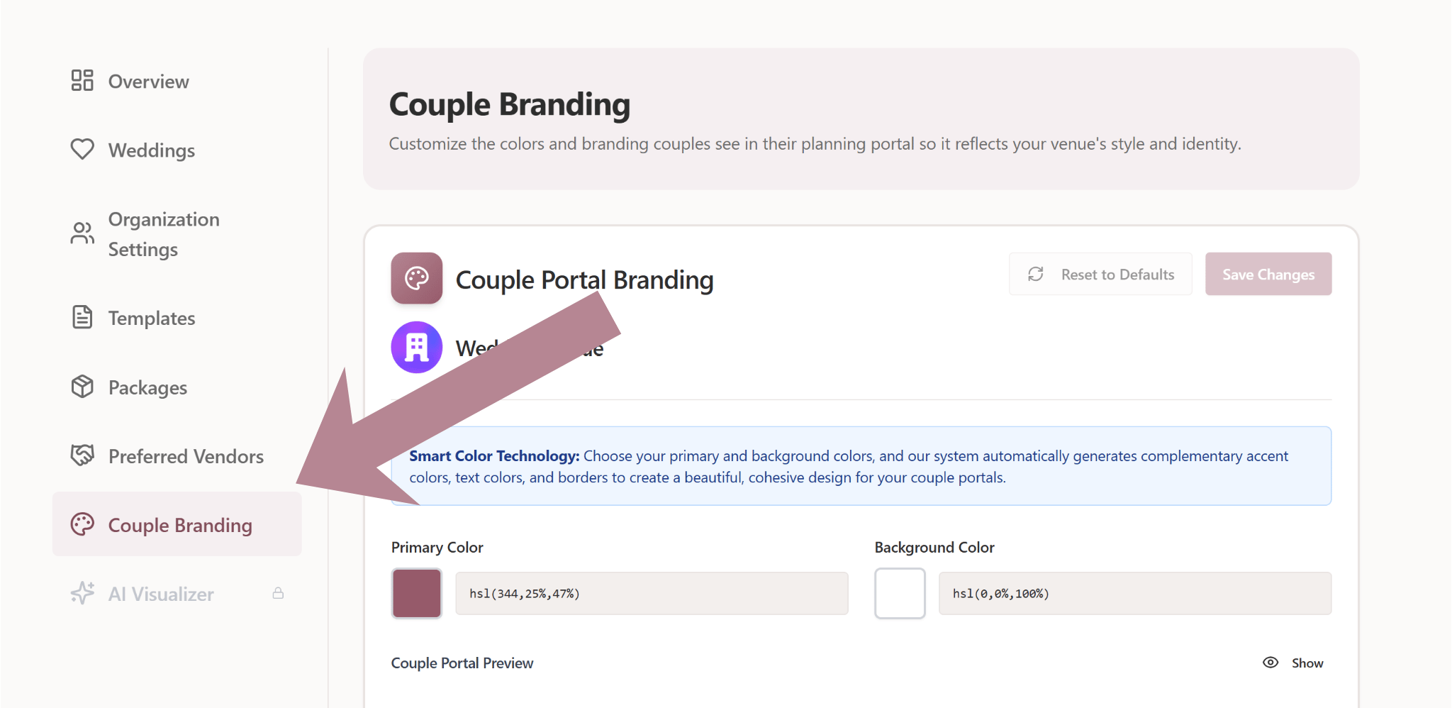 Tip: Choose colors that match your venue’s brand or website to create a consistent look and feel for couples interacting with your portal.