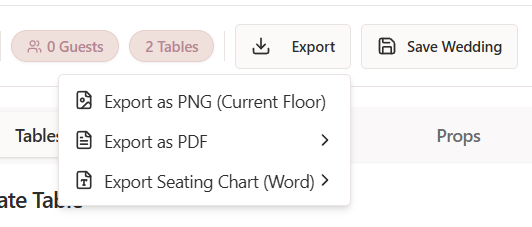 In Seated With Love, users can export their event floor plans to share layouts with venues, planners, couples, and event teams. Exporting a floor plan allows you to create visual copies of the layout that include tables, seating arrangements, venue elements, and building elements.