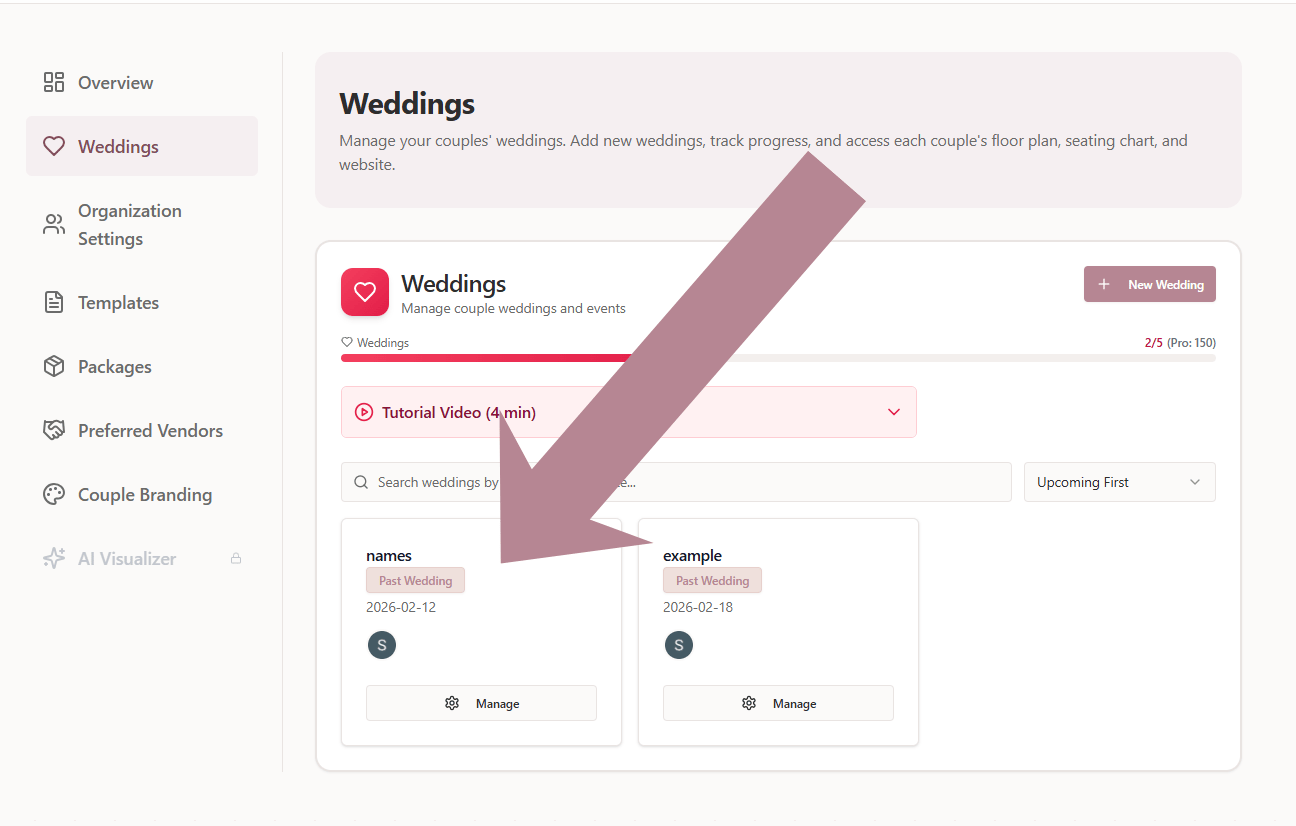 Click Weddings and locate the wedding you want to manage. Then click the Manage button.