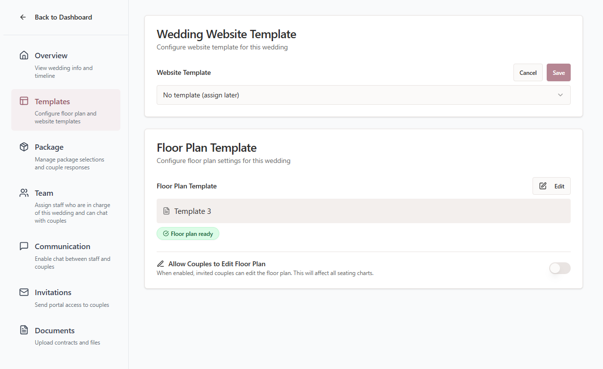 Tip: You can update these template settings at any time to adjust how couples use the wedding website and floor plan tools during the planning process.