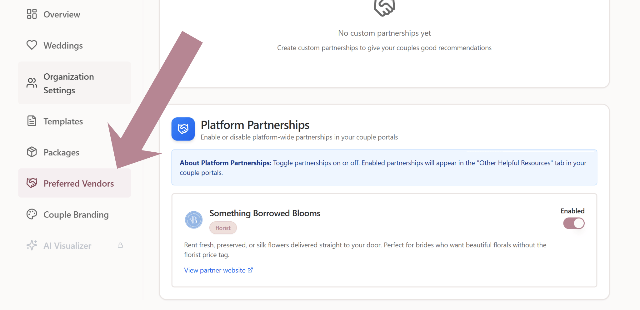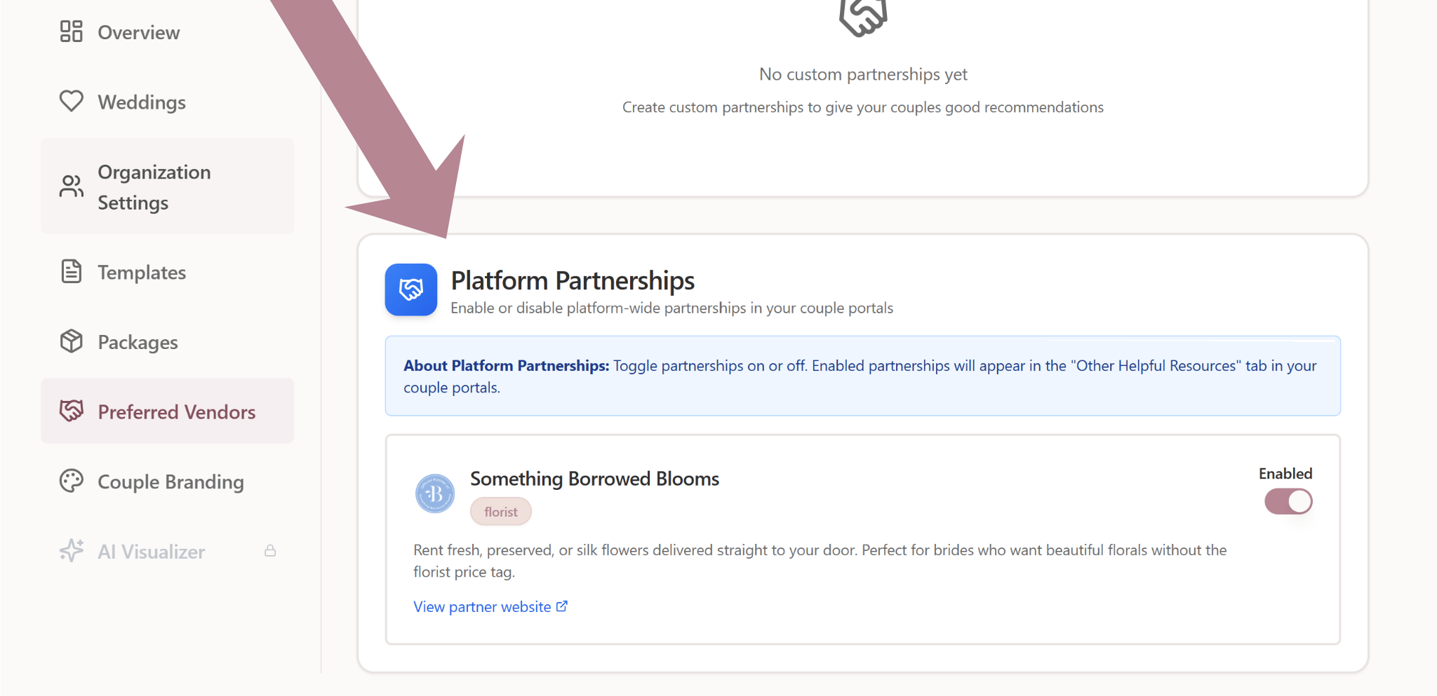 Platform Partnerships allow venues to enable curated companies that may benefit their couples during the wedding planning process. You can easily turn these partnerships on or off at any time, depending on whether you want them available to your couples.