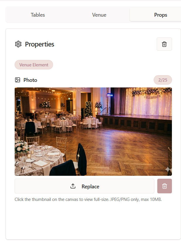 In Seated With Love, a Photo Marker allows venues and planners to attach real-world venue photos directly to a location within the floor plan. Uploading a photo marker helps couples and event planners visualize what the venue looks like from a specific position in the layout, improving the overall event planning experience.